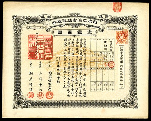 Nippon Kohyu Yugen Sekinin Kaisha [Japan Oil Pit LLC - apparently an early word for oil well or oil exploration] Y100 (Y30 paid in), Meiji 21[1888].9.15.