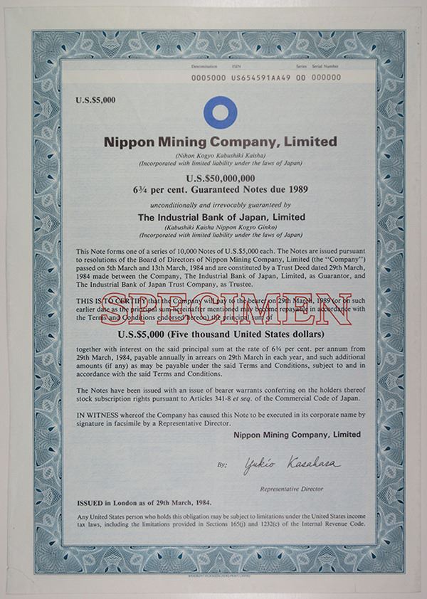Japan. $5,000 Specimen 6 3/4% Guaranteed Coupon Bond, Black print on blue border and underprint, Specimen Overprints, VF-XF condition, BW Ltd.