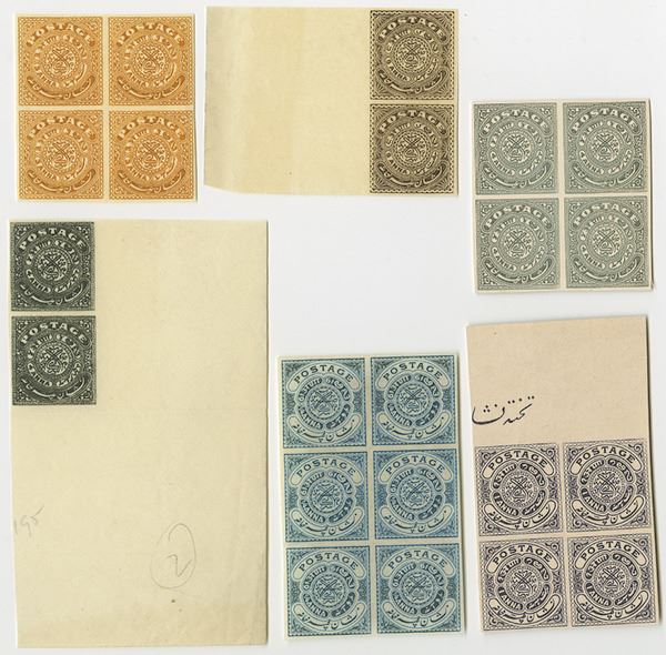 Hyderabad, India. Lot includes six different pairs or blocks of proof postage stamps with a total of 22 stamps, including 1/4 Anna (block of 6); 1 Anna (block of 4); 3 Annas (block of 4); 4 Annas (block of 4 + pair); and 8 Annas (pair). Different colors. MNH. (22 Stamps)