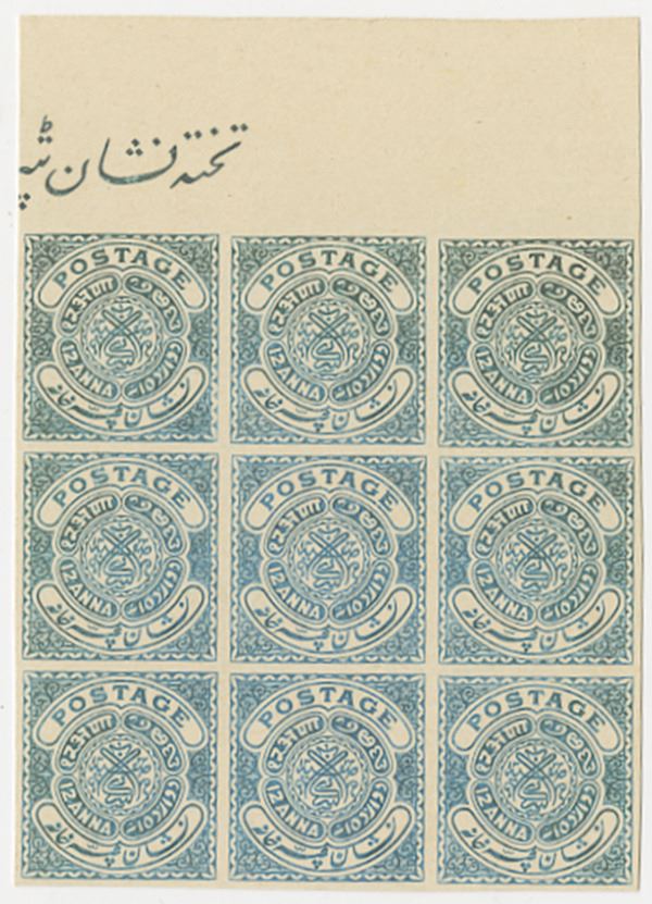 Hyderabad, India. Trial color proof postage 12 Annas, Scott #27, block of 9 stamps printed on thin card in blue (issued in blue-green) with wide margin.