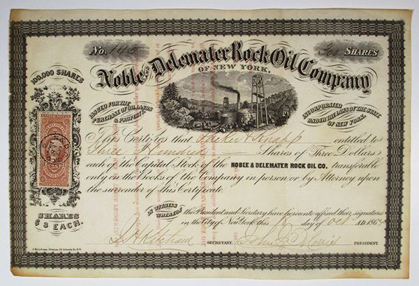 New York, 1864. 300 Shares I/U Capital Stock Certificate #145, Black text with black border, Scene at top center of an oil field with men at work. Fine condition with some toning along left and bottom margins.