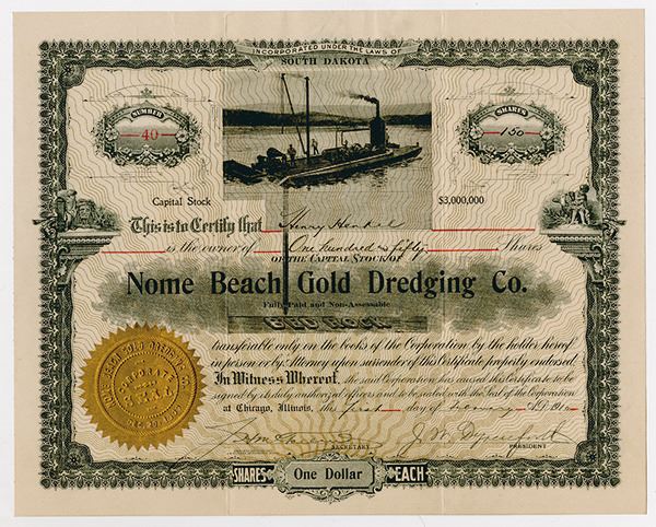 Alaska (Inc. in South Dakota). 150 shares, I/U, vignette of dredge boat at top center, issued 1910. Very Fine. S/N 40, Rare Alaska mining certificate.