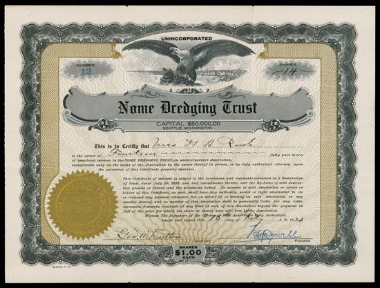 Washington, 1923, 14 Shares, Issued and Uncancelled Stock, #12, Black print on gold and black border and underprint, Bald Eagle top center, VF condition.