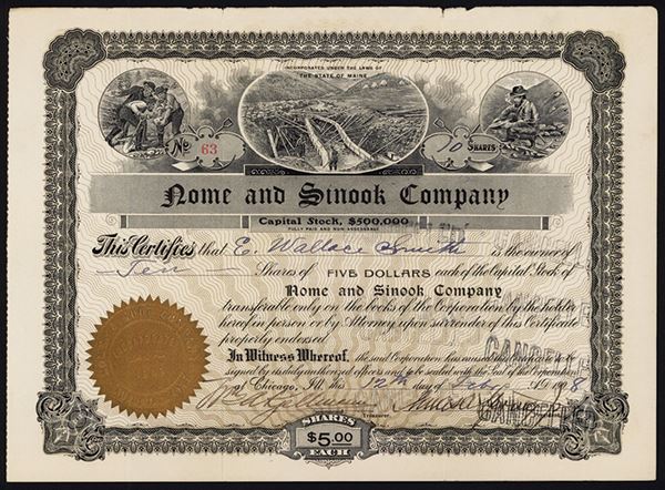 Alaska, 1908, 10 Shares, I/C, Miners flank sluice ways with miners in middle, gold seal, ink cancelled hand stamps, Cert.#63, VF condition. Scarce Alaska mining stock.