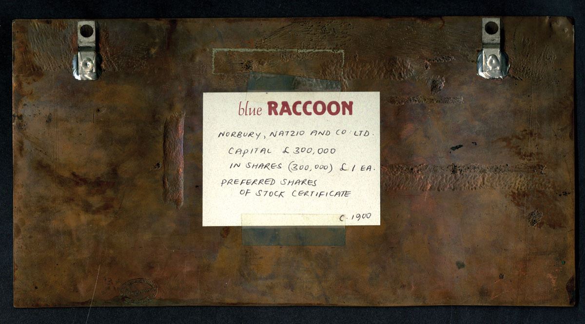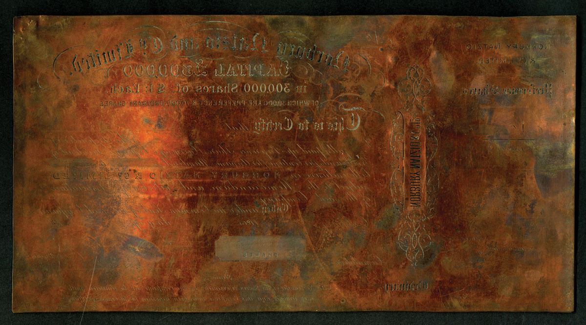 Great Britain. ca.1830-1860, 13-1/4 x 7 inches. Copper printing plate for stock. Now with two angled brackets soldered onto the back for hanging. Slightly wavy, polished in the past and now irregularly tarnished due to handling. A great display item when properly cared for again.
