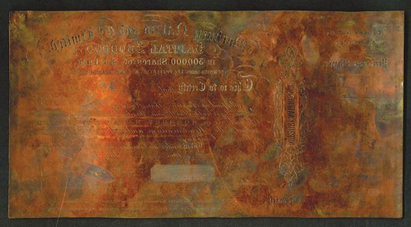 Great Britain. Copper printing plate for stock. Ca. 1900. Now with two angled brackets soldered onto the back for hanging. Slightly wavy, polished in the past and now irregularly tarnished due to handling. A great display item when properly cared for again. 13-1/4 x 7 inches.