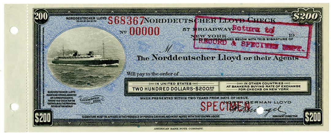 Germany and U.S., ND (1920-30s). $200 Specimen Norddeutscher Lloyd Traveler's Check, Black text with black border and blue background. Red specimen overprint, Return to Record & Specimen Dept. stamp at top right, 00000 serial numbers, and POCs. Choice AU to Uncirculated condition, ABNC.