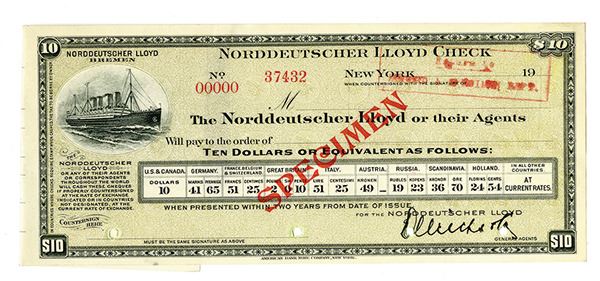 Germany and New York. $10 Specimen, Orange red on light yellow paper, Ocean liner on left, Foreign currency conversion on bottom. Specimen overprint, POC's and "000000" serial numbers, AU-Unc., Perforations on left side. Rare as specimen. ABNC