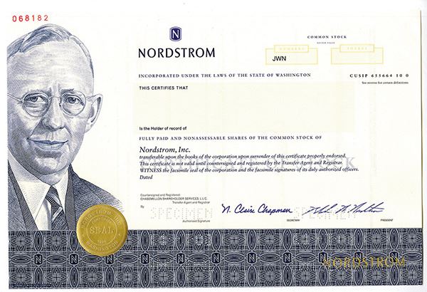 Washington, 2000. Odd Shares Specimen Stock Certificate, Black text with blue border at bottom, Portrait of John W. Nordstrom at left. Specimen POCs, XF condition, ABNC. Nordstrom, Inc. is an American luxury department store chain. Founded in 1901 by John W. Nordstrom and Carl F. Wallin, it originated as a shoe store and evolved into a full-line retailer with departments for clothing, footwear, handbags, jewelry, accessories, cosmetics, and fragrances.