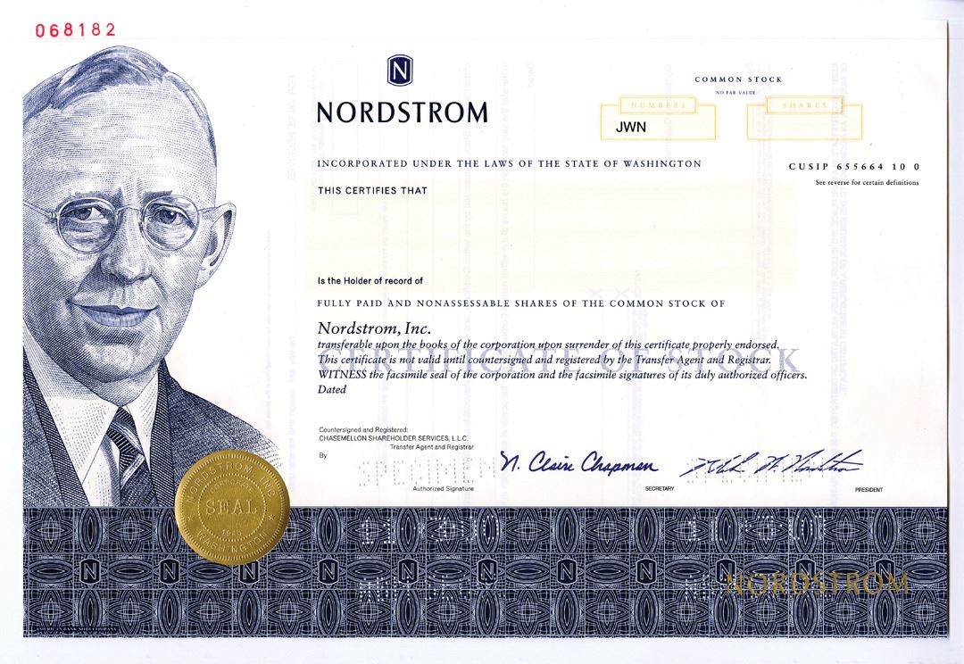 Washington, 2000. Odd Shares Specimen Stock Certificate, Black text with blue border at bottom, Portrait of John W. Nordstrom at left. Specimen POCs, XF condition, ABNC. Nordstrom, Inc. is an American luxury department store chain. Founded in 1901 by John W. Nordstrom and Carl F. Wallin, it originated as a shoe store and evolved into a full-line retailer with departments for clothing, footwear, handbags, jewelry, accessories, cosmetics, and fragrances.