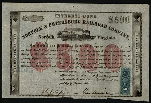 Virginia, 1867, $500, 8% Interested Bond Issued and Uncancelled, #19, Black print with vignette center of moving locomotive, VF condition, Murphy & Co. Printers. Signed by William Mahone as President. Mahone was a U.S Senator from Virginia during the 1880's and reached the rank of Major General of the Confederate Army.