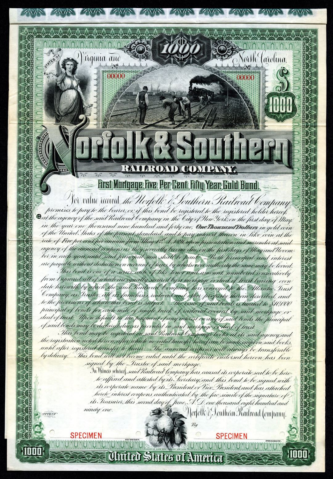North Carolina and Virginia, 1891, $1000, Specimen, 5% 1st Mortgage Gold Bond. Black with green border and underprint, Impressive vignette with locomotive approaching track workers with allegorical woman on left over ornate title, cotton boll on bottom. Coupons attached. Red specimen overprints, POC's and "00000" serial numbers. XF condition. Rare and very attractive railroad bond that is only known as a Specimen in Cox, no issued examples known . ABNC.