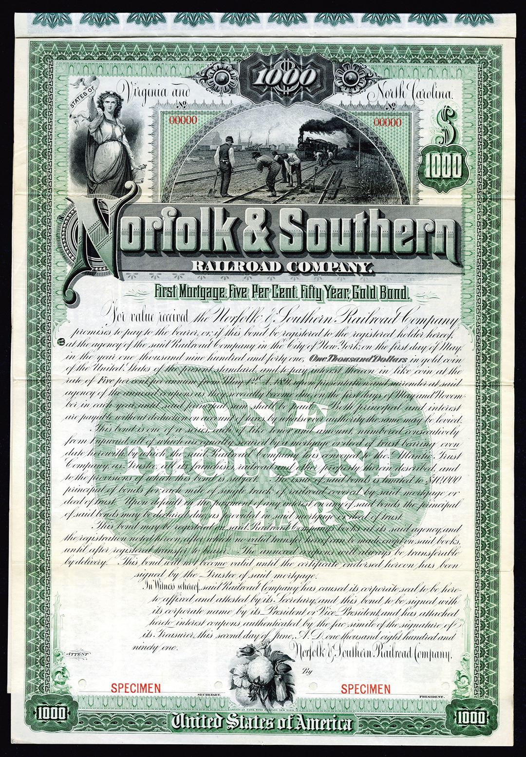 North Carolina and Virginia, 1891, $1000, Specimen, 5% 1st Mortgage Gold Bond. Black with green border and underprint, Impressive vignette with locomotive approaching track workers with allegorical woman on left over ornate title, cotton boll on bottom. Coupons attached. Red specimen overprints, POC's and "00000" serial numbers. XF condition. Rare and very attractive railroad bond that is only known as a Specimen in Cox, no issued examples known . ABNC.