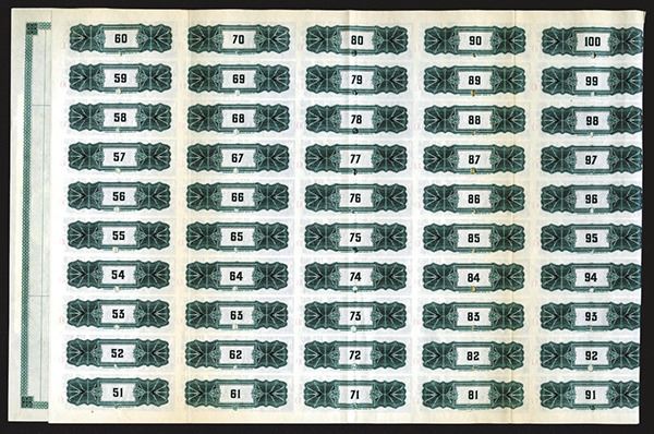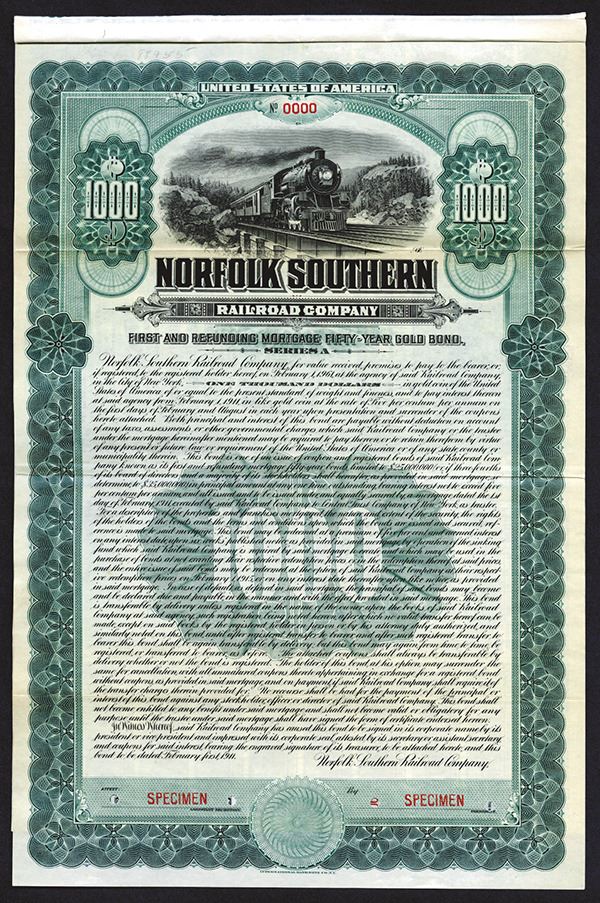 Virginia, 1911, $1000 Specimen 1st and Refunding Mortgage Gold Bond, Green Border, locomotive over bridge with rocky hills with trees in background, Coupons Attached, POC, XF condition, Listed railroad in Cox but unlisted as bond, only as a stock. International BNC. Listed railroad and bond variety in Cox.