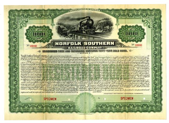Virginia, 1911. $1000 Specimen 5% Registered First and Refunding Mortgage Gold Bond, Black text with green border and underprint, Train passing over bridge at top center. Red specimen overprints, 00000 serial numbers, and POCs. VF condition, IBN. Listed as rare in Cox.