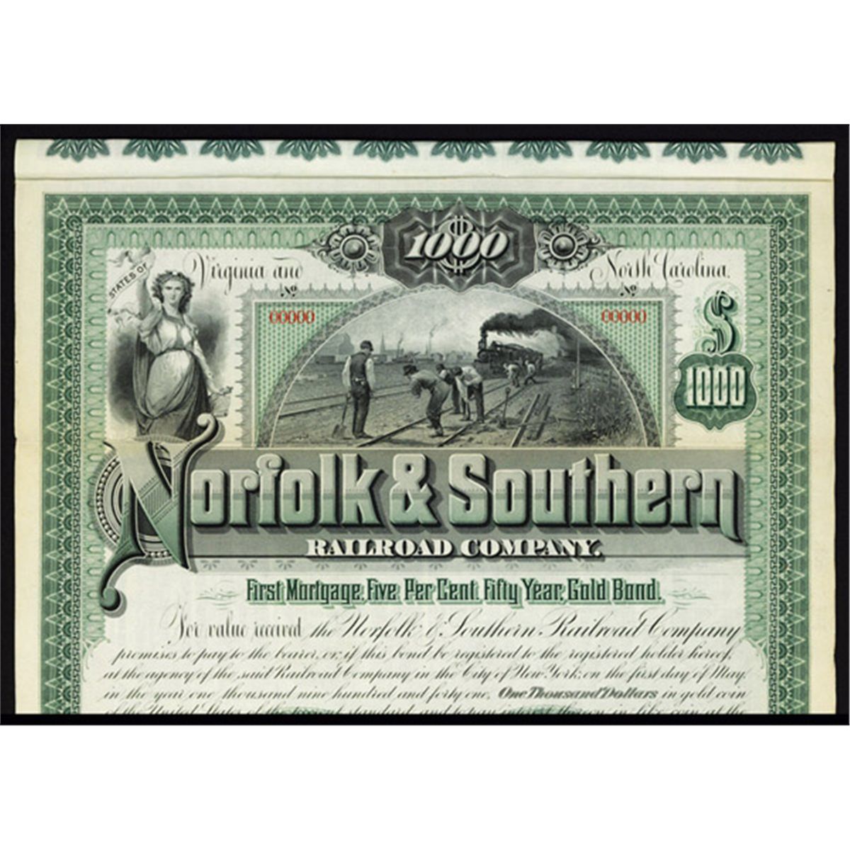 North Carolina & Virginia, 1891, $1000, 1st Mortgage 5% Gold Bond, Specimen, Black on green border and underprint, Track workers with train approaching on top with allegorical woman on left and cotton boll on bottom, coupons attached, VF-XF condition, ABNC. Scarce and very attractive bond.