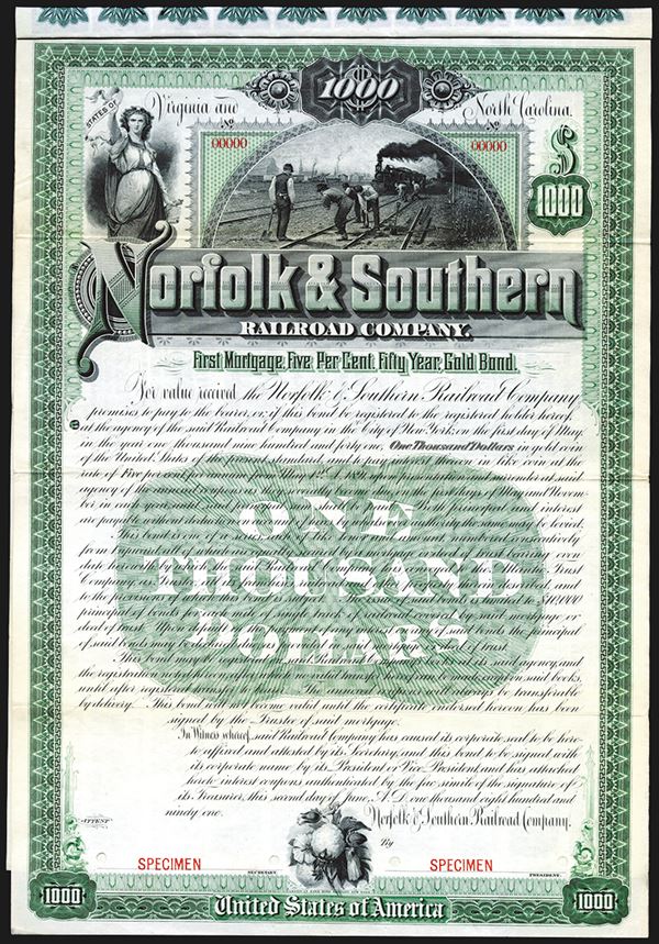 North Carolina and Virginia, 1891, $1000, Specimen, 5% 1st Mortgage Gold Bond. Black with green border and underprint, Impressive vignette with locomotive approaching track workers with allegorical woman on left over ornate title, cotton boll on bottom. Coupons attached. Red specimen overprints, POC's and "00000" serial numbers. XF condition. Rare and very attractive railroad bond. ABNC.