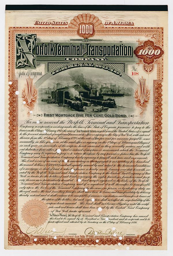 Virginia. $1,000, bond, terminal scene with trains l-r, vertical format, 1st mortgage, bearer gold coupon, 5%, 50-yr, 1898, due 1948, by ABN, usually heavily cancelled.