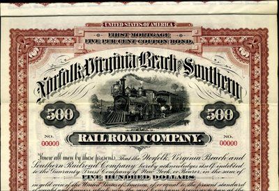 Norfolk, Virginia. 1896. $500. Specimen 1st Mortgage 5% Coupon bond. Brown border. Flagman with locomotive. VF condition with light splits on margins near folds in middle. Coupons attached. Red specimen overprints and POC's. Rare and attractive bond. Unlisted in Cox. ABNC.