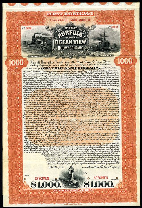 Virginia, 1898, $1000, 5% Gold Specimen Bond, Vertical format, Coupons attached, Moving locomotive on left, steamships on right, POC's, ABNC. Unlisted railroad in Cox.