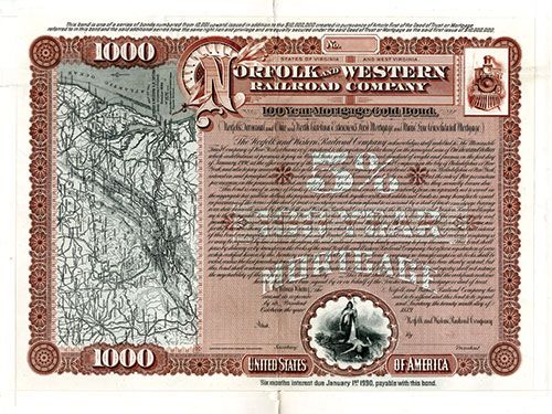 Virginia and West Virginia, 1889, $1000, 5% 100 Year Mortgage Gold Specimen Bond, Black on brown border and underprint, Moving locomotive head-on top right corner and railway route map left side, VF condition with some vertical splitting, ABNC. Listed in Cox but very possibly only one found only known as proof not issued or specimen.