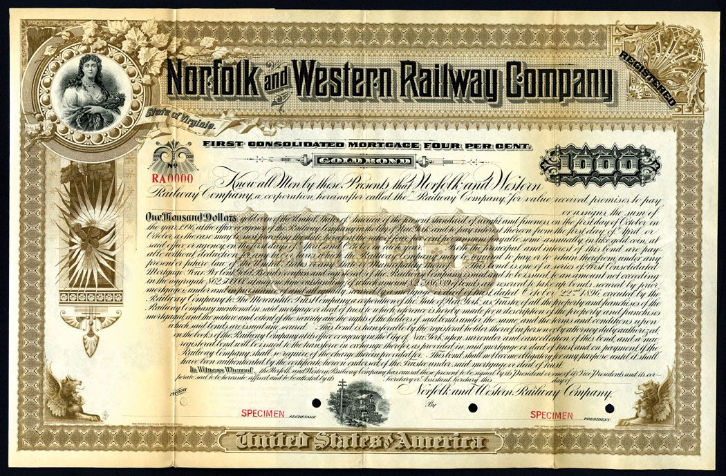 Virginia, 1896, $1000, Registered 1st Consolidated Mortgage 4% Gold Specimen Bond, Olive border and underprint, Allegorical woman on top left corner, VF condition, ABNC. Listed in Cox but scarce.