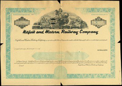 VA. 1964-1965. 4 different certificates. The first 3 have vignette of allegorical woman holding globe with cargo train at her feet. 1) Proof of $ odd, turquoise, registered bond printed on light brown paper with large margins. 2) Proof of $1000, orange, coupon bond, printed on light brown paper. 3) Specimen of previous certificates dated 1965 in brown. 4) Specimen of $1000, purple, Equipment Trust Certificate with coupons. Also included is production department correspondence. SCBNC. XF.