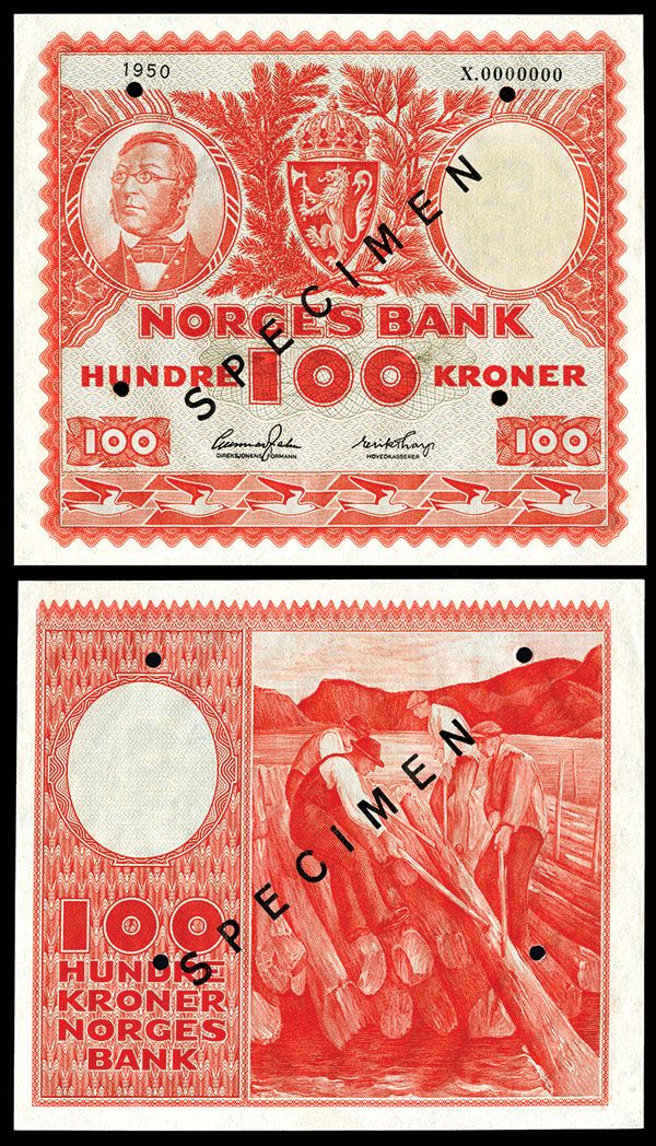 Norway, 1950, 100 Kroner, Specimen banknote, Specimen overprints, POC's, S/N X. 0000000, Uncirculated condition, attractive large format notes.