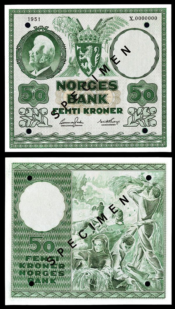 Norway, 1951, 50 Kroner, Specimen banknote, Specimen overprints, POC's, S/N X. 0000000, Uncirculated condition, attractive large format notes.