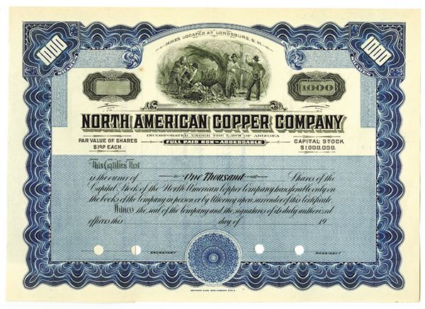 Mines Located in Lordsburg, N.M., (Inc. in Arizona), ND (1900-20's). 1000 Shares Specimen Capital Stock Certificate, Black text with blue border and background, Men at work in mine at top center. POCs, Fine condition, SBNC.