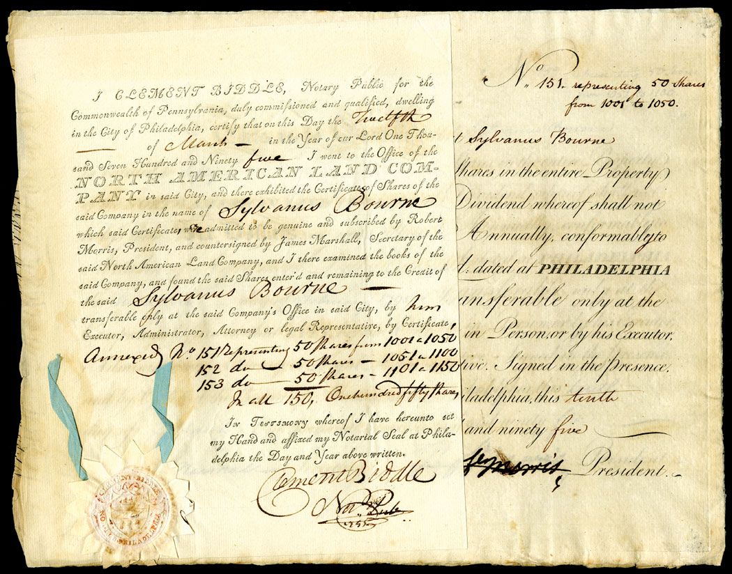 Three common stock certificates, bound together with a ribbon to include a statement signed by Clement Biddle that these are the property of Sylvanus Bourne. Also signed by Robert Morris as president and James Marshall as secretary. This group of three is now rare, as many were untied to sell as single pieces, thus a fine collector's item. The certificates are in very fine condition, lightly cancelled, and highly desirable.