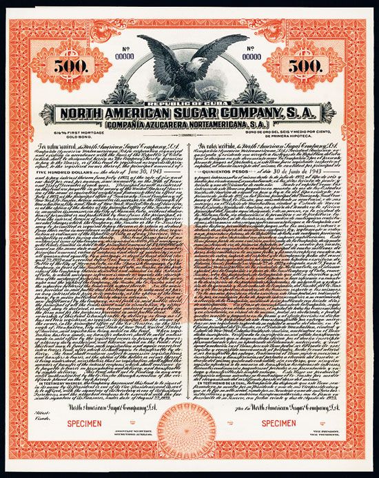Cuba, 1923, $500, Specimen 6.5% Mortgage Bond, Orange border with eagle vignette, Coupons attached, POC's, XF.
