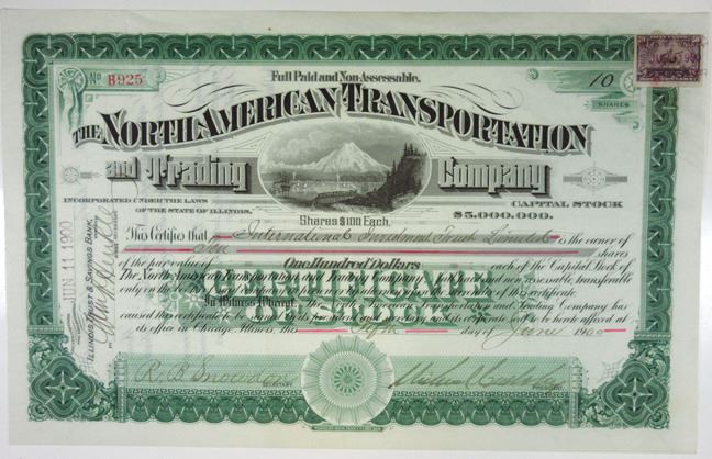 Alaska (Inc. in Chicago, IL.) 10 Shares, I/U. Black on green border, Mountain in middle with small trains and ships in harbor, VF condition. WBNC.