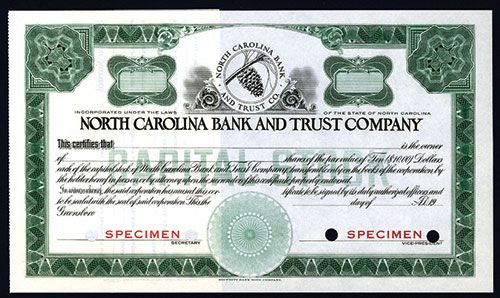 North Carolina, 19xx, Specimen Stock, Odd Shares, Black print on green border and underprint, Bank logo top center, Red specimen overprint and POC's, VF-XF condition, SBNC.
