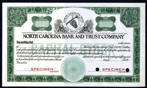 North Carolina, 19xx, Specimen Stock, Black on green border and underprint, Company logo top center, Red SPECIMEN overprints and POC's, VF-XF condition, SBNC.