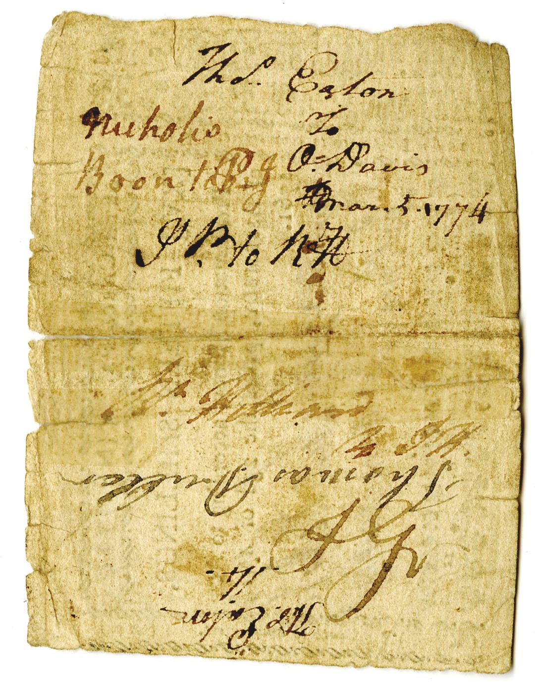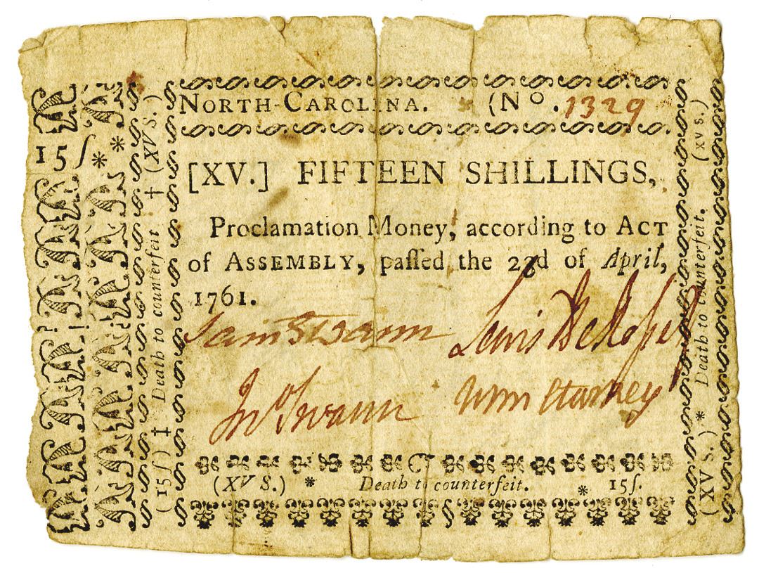 North Carolina. 1761 Proclamation Money, 15 Shillings, Printed on thinner rag type non-watermarked paper. S/N 1329, Printed on one side, but with a multitude of signatures (Lewis de Rosset, John Starkey, John & Samuel Swann) and reverseæ shows colonial scribblings, notations etc. VG to Choice VG with several splits with a hinge repair. This money was worth what Queen Anne set it at and was enforced from 1704 until the start of the American Independence Movement in 1775.