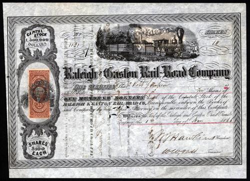 North Carolina. 1866, 10 Shares, #1131, I/U stock certificate, Black border with Locomotive L/R vignette, Revenue stamps attached, VF condition with pin hole on left margin.