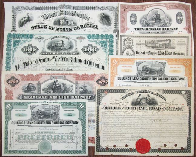 North Carolina, Virginia, Alabama, Ohio, Mississippi, Tennessee, 1856-1958. Collection of 8 I/C Railroad Stock and Bonds. Includes Mobile and Ohio Rail Road Co., Virginian Railway Co., Gulf, Mobile and Northern Railroad Co. and more. Certificates range from VF to XF condition. Sold "AS IS" no returns accepted. (8).