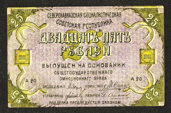 Russia - North Caucasus. 25 Ruble. P-S448b. Sickles, Hammer and Wheat in bold design. Choice About Uncirculated or better. (The Silicon Valley Collection)
