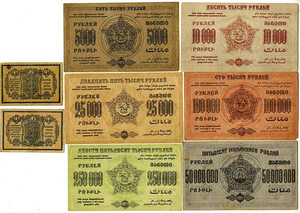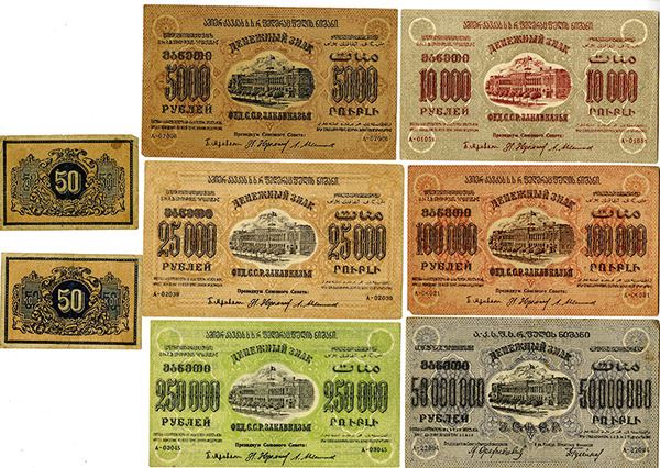 Russia - North Caucasus, includes pair of 50 Kopeks issued in 1918 by Ekaterinodar Government Bank, P-S494A; also from Transcaucasia 1923-1924 currency token issues 5000 Rubles, 10000 Rubles, 25000 Rubles, 100000 Rubles, 250000 Rubles, and 5000000 Rubles. Generally Fine to Very Fine.