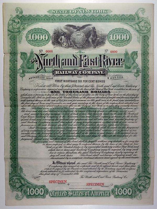 New York. Specimen $1000 6% First Mortgage Gold Coupon Bond, Black text with ornate green border and undertint, Illustration of the Seal of New York City at top. Red Specimen overprints, "0000" serial numbers, and POC's, VF condition with signs of splitting along left margin folds, Printed by ABNC. Unlisted design and type in Cox, Rare. Only 2 examples were found in the ABN Archives in 2002.