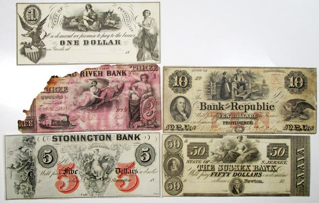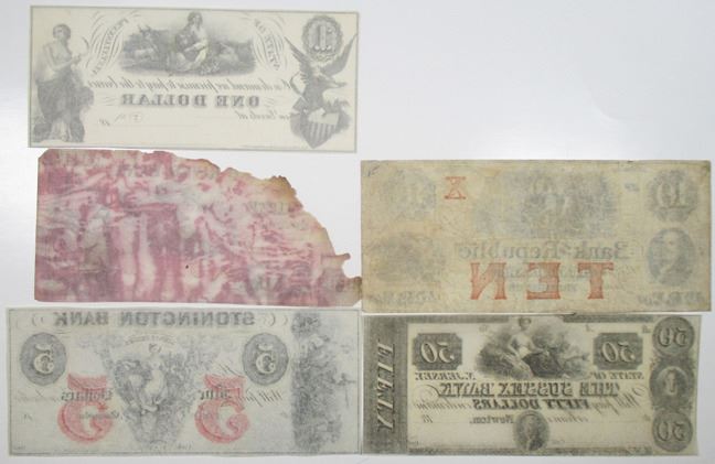 Lot of 5 notes, Includes CT., Stonington Bank, Remainder, Unc.; Newton, NJ, $50, Remainder, Unc.; R.I., Bank of the Republic, $10, Issued, Fine to Choice Fine condition; and 2 other notes. (5).