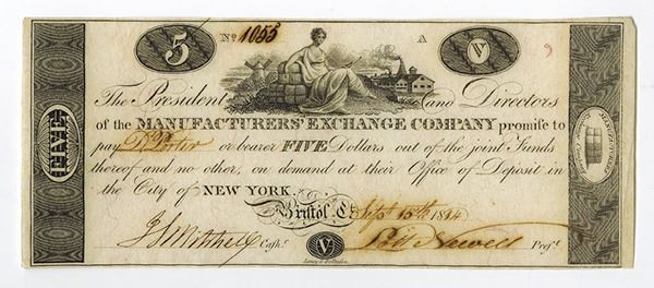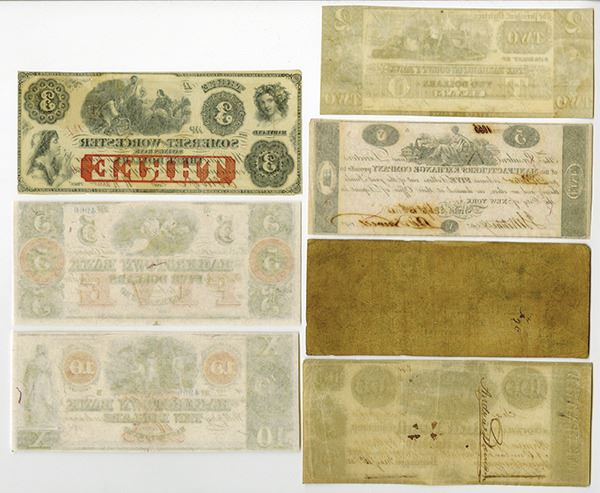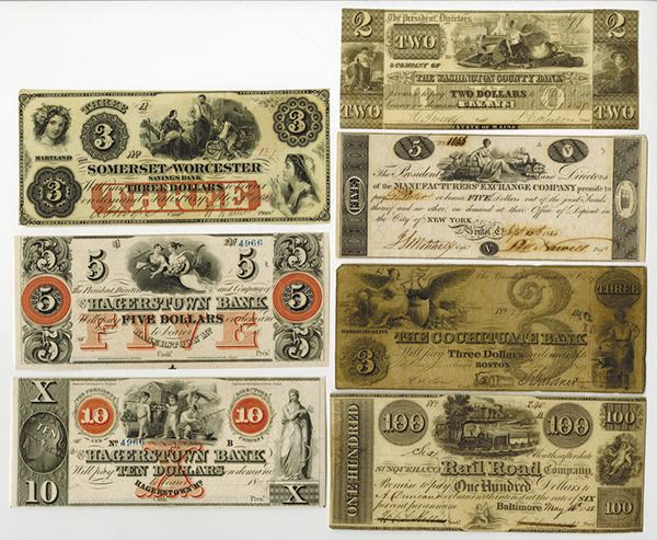 Lot of 7 notes, Includes Maine, Washington County Bank, $2, Choice VF; Massachusetts, Cochituate Bank, $3, VG; Maryland includes Hagerstown Bank, $5 and $10 Remainders, Uncirculated, Somerset and Worcester Savings Bank, $3, 1864, Issued, S/N 137, Crisp Choice VF with a pin hole, and Baltimore and Susquehanna Rail Road Co., 1838, $100, VF, Pin holes; Connecticut, 1814, Manufacturers' Exchange Co., $5, AU, Issued. Attractive assortment.