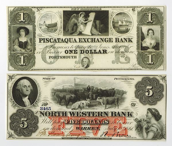 PA. NH. Lot of 2 notes, Includes Piscataqua Exchange Bank, $1, Remainder, AU to Choice AU, TCC; and North Western Bank, $5, Issued and uncancelled, Black on red underprint, Crisp uncirculated, National BNC.