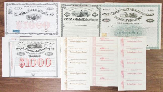 New York, Massachusetts, Ohio. Assortment of Railroad related Items, Includes: Mansfield Framingham Rail Road Co., I/C Bond; New York & New Haven Rail Road Co., Unissued Bond; Cincinnati and Springfield Railway Co., I/C Bond; New York & New England Railroad Co. I/U Bond; N.Y. & N.H. Railroad Co. Uncut Sheet of Unissued Checks; New York and New Haven Rail Road Co. Uncut Sheet of Unissued Checks (2). Pieces are in Fine-VF condition. (7). Sold "AS IS" no returns accepted.