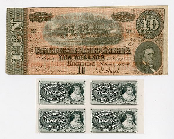 Georgia. Lot of 2 items, Includes 1864 10 Dollar CSA note with Letterpress printed advertisement for the North Georgia Fair on back of the Best Route from the North and West to Florida and the South is via Atlanta, Fine to VF. Also included is a block of proof tickets printed in black on india paper, 4.75 x 2.5 inches, Unc. ABNC. Interesting Georgia related pair of notes.