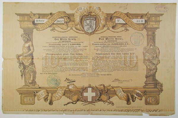 Netherlands, 1888. 10 Guilders I/U Premium Bond in Dutch, German on front, English and French on back, Black text with ornate brown border and tan background. VG to Fine condition with some staining and archival reinforcement along margins. Evidently issued for organization similar to the Red Cross in the U.S.