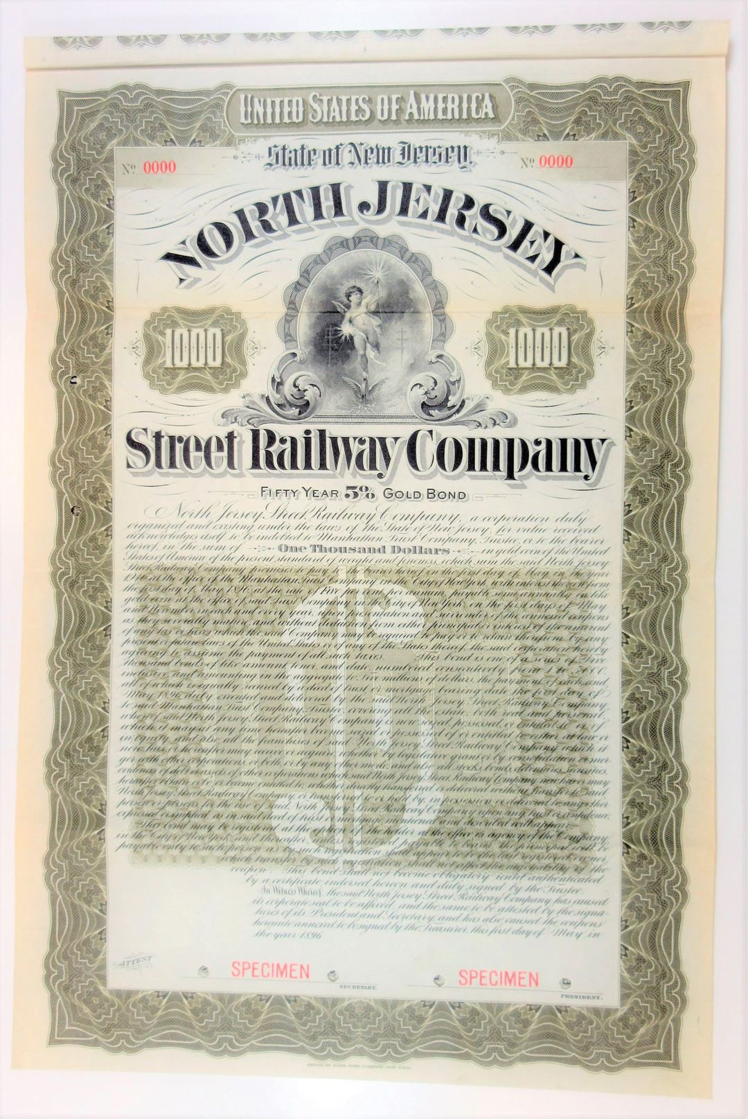 New Jersey. Specimen $1000 Fifty Year 5% Gold Coupon Bond, Black on Olive green border and underprint, allegorical cherub holding light bulb on top middle, Specimen overprints, POC's and "0000" serial numbers, VF/XF condition, ABNC. Listed railroad in Cox, Unlisted as a bond, only known as a stock certificate. Only 2 bonds were found in the ABN Archives in 2002 and this is the only one that is available.