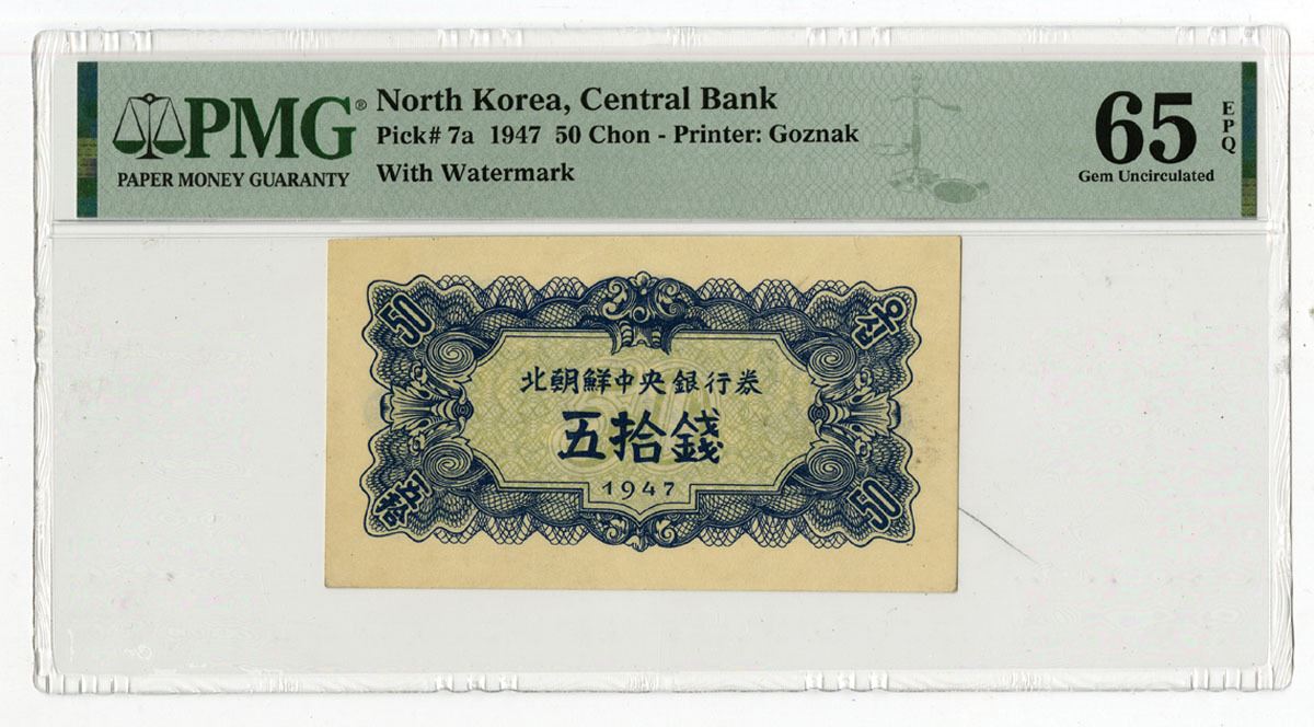 North Korea, 1947. 50 Chon, P-7a, Issued banknote with watermark, Blue on light lime green, back blue, No S/NS, PMG graded Gem Uncirculated 65 EPQ. This is the highest graded note in the T&P census.