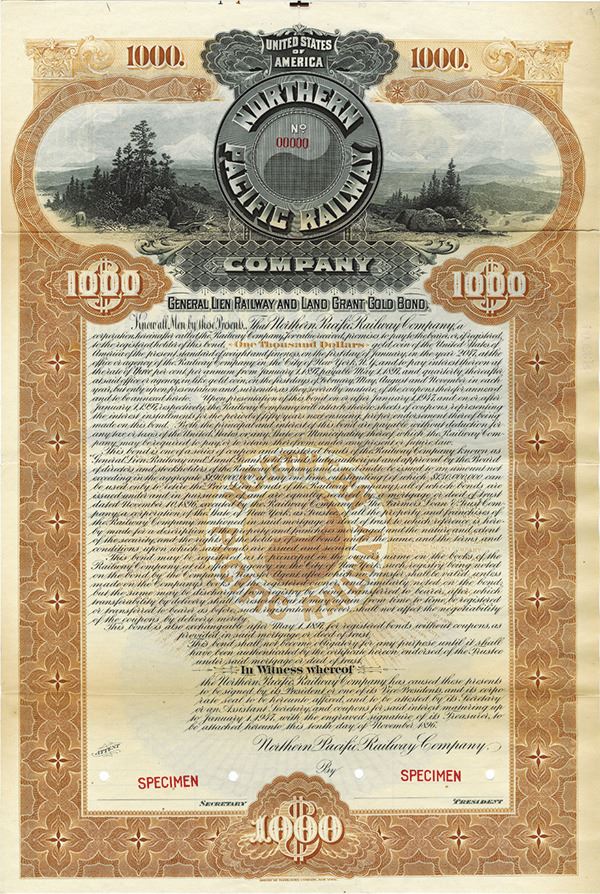 Minnesota. $1000 Specimen 3% General Lien Railway and Land Grant Gold Coupon Bond, Black print on brown border and under tint, View from top of a mountain at top with company title, Specimen overprints and POC's, Coupons not attached, Fine-VF condition with splitting along fold lines condition, ABNC.